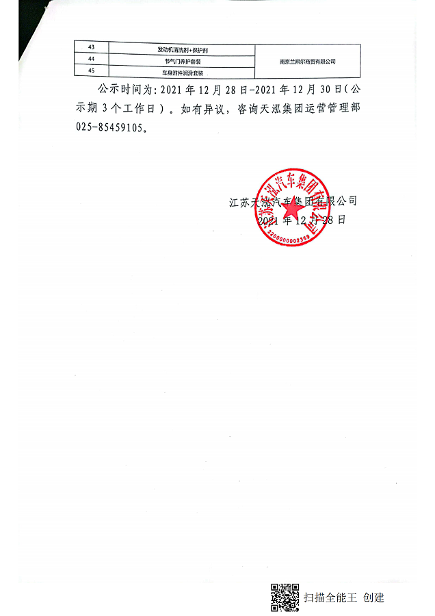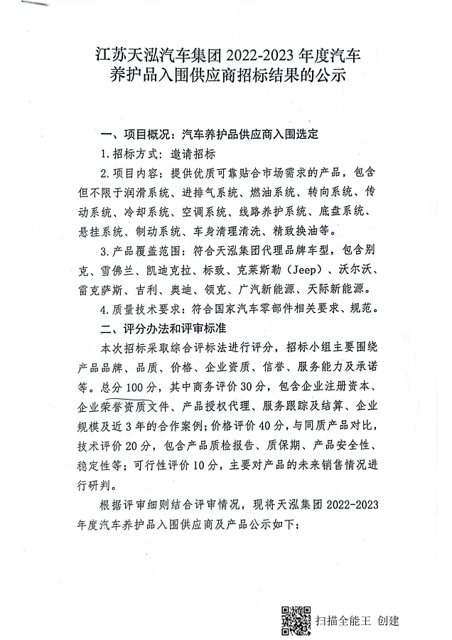 江苏天泓汽车集团2022-2023年度汽车养护品供应商入围招标评审情况公示