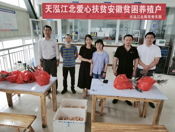 受家庭重大变故影响,农户宋开贵家饲养的千余只小鸡急于出售,南谯区经信局通过网络渠道发出了扶贫助农倡议,天泓江北党支部获知消息后立即主动对接,表示希望为贫困户做些实事。随后,支部在工作群发出爱心帮扶通知,党员及广大职工纷纷开始现场认购,还主动帮助农户推广鸡蛋等农副产品,为农户解燃眉之急。在党支部的积极号召下,职工食堂和个人共订购小鸡近100只、鸡蛋600个,为农户创收近5000元。