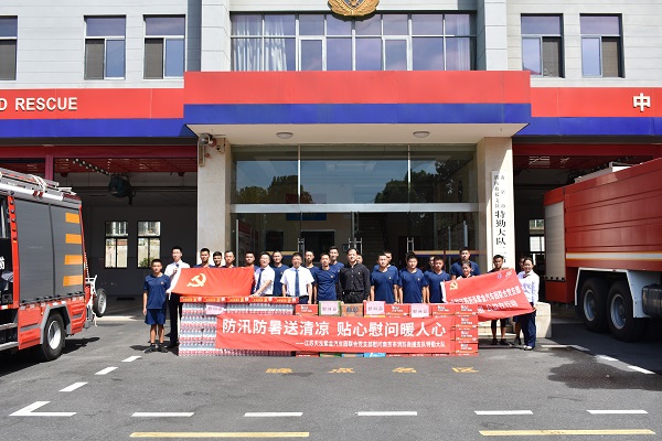 8月以来,南京市高温晴热天气持续。近期,天泓紫金汽车园联合党支部和南京市消防救援支队特勤大队进行共建座谈,慰问高温下坚持训练备勤的消防官兵,为他们送上清凉饮料、方便食品等慰问品,以此表达对忠于职守、赴汤蹈火、一心为民的消防官兵们的崇高敬意及由衷感谢。