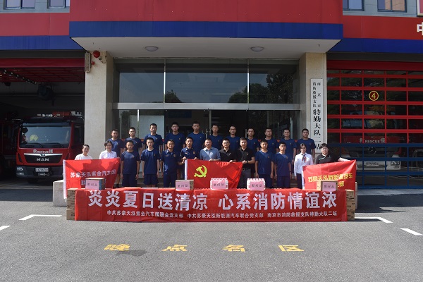 8月23日下午,苏豪天泓新能源汽车联合党支部、天泓紫金汽车园联合党支部与南京市消防救援支队特勤大队进行了共建座谈,慰问高温下坚持训练备勤的消防官兵,为他们送上饮料、方便面等慰问品,希望能够给他们带去一份清凉和温馨。