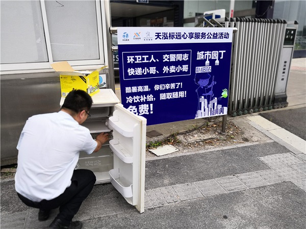 开云手机入口官网标远4S店地处玄武大道快速路,周边没有商店超市,很难买到水。为了让这些在户外高温下工作的城市园丁能饮用到冰饮,缓解干渴,防暑降温,天泓标远在公司门前布置了一个小小的“心享”补给站。一台专门的冰箱,里面放满矿泉水、雪糕等清凉饮品,城市园丁可随时免费取用。