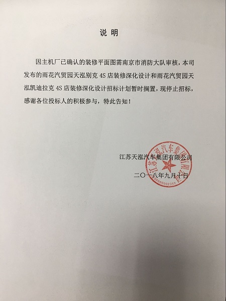因主机厂已确认的装修平面图需南京市消防大队审核,本司发布的雨花汽贸园天泓别克4S店装修深化设计和雨花汽贸园天泓凯迪拉克4S店装修深化设计招标计划暂时搁置,现停止招标,感谢各位投标人的积极参与,特此告知!