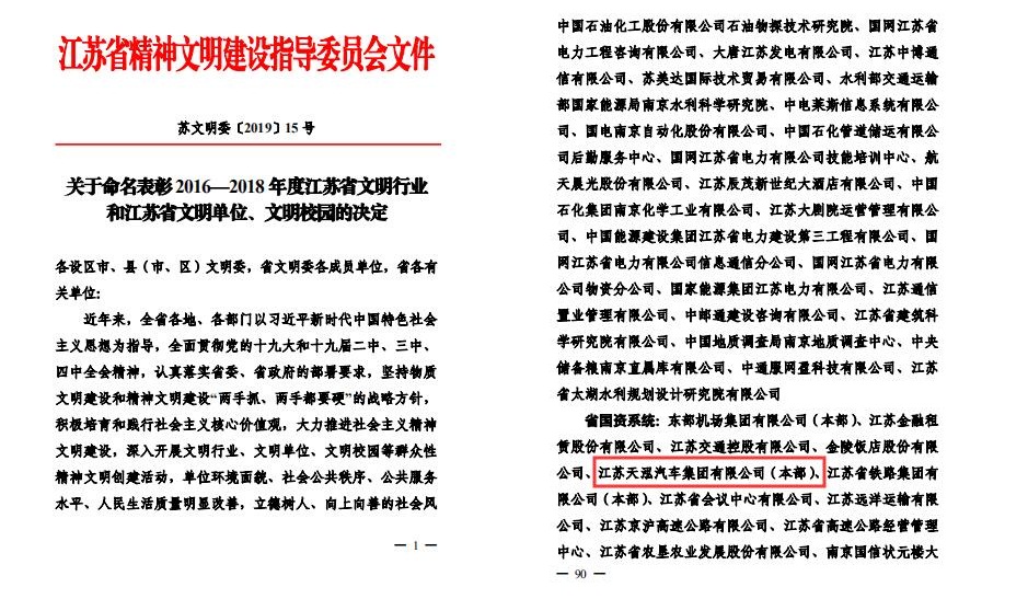 12月7日,江苏省精神文明建设指导委员会公布《关于命名表彰2016—2018年度江苏省文明行业和江苏省文明单位、文明校园的决定》,江苏天泓汽车集团有限公司荣获“2016-2018年度江苏省文明单位”,连续8年斩获这一殊荣。