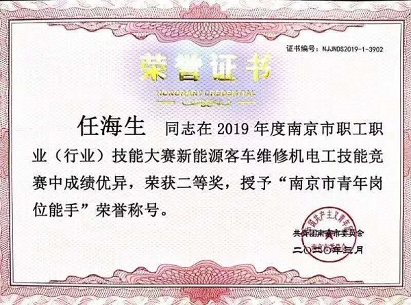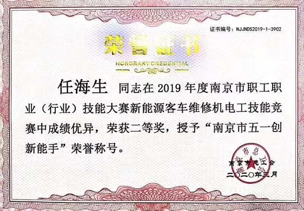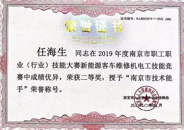 2020年9月8日,南京市总工会公布了2019年度南京市职工职业(行业)技能大赛新能源客车维修机电工技能竞赛成绩,开云手机入口官网下属天泓服务公司技术总监任海生获二等奖。