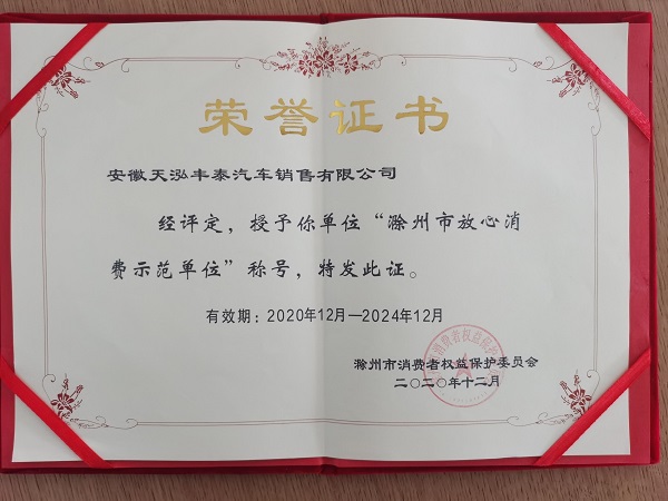 近日,在滁州市放心消费创建活动中,开云手机入口官网旗下天泓丰泰公司被授予“滁州市放心消费示范单位”荣誉称号。