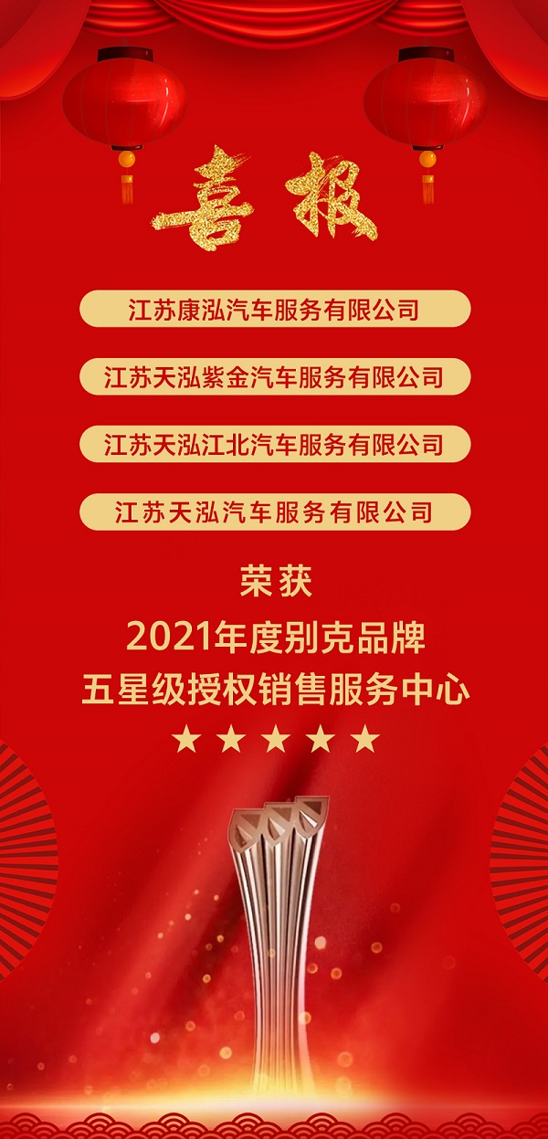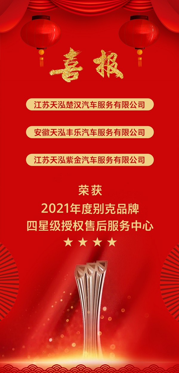天泓服务、康泓、紫金、江北四家单位均荣获“2021年度别克品牌五星级授权销售服务中心”最高荣誉,天泓服务、康泓、江北三家单位获得“2021年度别克品牌五星级授权售后服务中心”最高荣誉。其他单位也获得多项星级荣誉,其中,天泓楚汉、丰乐、瑞杰三家单位获得“2021年度别克品牌四星级授权销售服务中心”称号,天泓楚汉、丰乐、紫金三家单位获得“2021年度别克品牌四星级授权售后服务中心”称号;天泓丰泰获得“2021年度别克品牌三星级授权销售服务中心”称号,天泓瑞杰、丰泰两家单位获得“2021年度别克品牌三星级授权售后服务中心”称号。