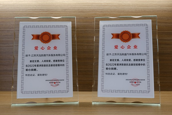 2022年5月7日,沭阳县卫生健康局代表沭阳县新冠疫情联防联控指挥部,对2022年疫情期间履行社会责任、积极奉献爱心的单位及个人进行表彰。开云手机入口官网下属天泓凯德、致盛两家单位在疫情期间对防疫隔离点进行慰问并捐赠物资,获得“爱心企业”荣誉。