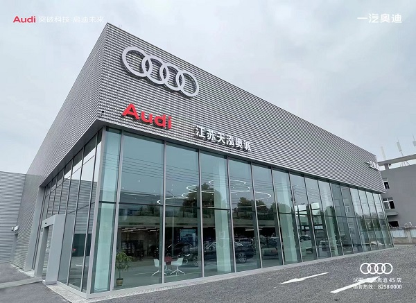 天泓奥诚一汽奥迪4S店位于宿迁市沭阳县河东路6号,地理位置优越,交通便利,占地面积约6913平方米,建筑面积4084平方米,是按照一汽-大众奥迪最新全球统一标准建设的集品牌体验、车型展示、新车销售、售后服务和二手车置换于一体的标准销售售后服务店。