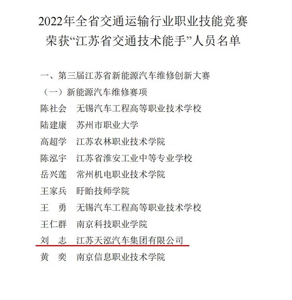 为认真贯彻落实习近平总书记关于技能人才、技能工作系列重要指示精神,进一步发挥职业技能竞赛在技能人才队伍建设中的重要作用,激励广大交通运输行业劳动者走技能成才、技能报国之路,江苏省交通运输厅于2023年3月11日举办了2022年度全省交通运输行业职业技能竞赛。近日,省交通运输厅发布了2022年度“江苏省交通技术能手”名单,苏豪天泓旗下子公司天泓华奥售后车间组长刘志凭借精益求精的技术,荣获“江苏省交通技术能手”称号,并在新能源汽车维修赛项目中荣获“优秀选手”称号。