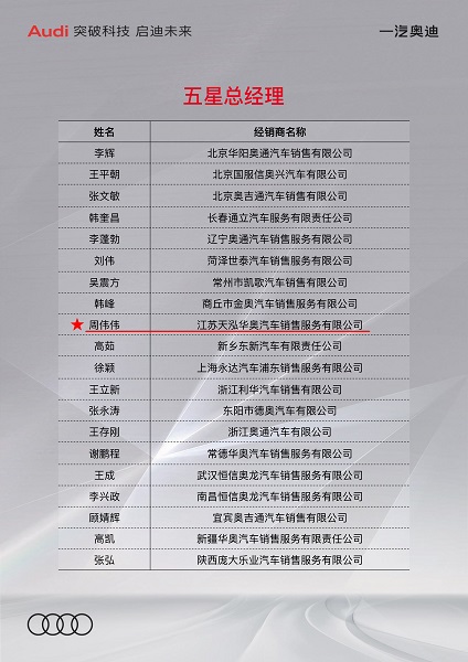 一汽奥迪推出了2023年“总经理星级评价”活动,旨在激发优秀人才的干事创业热情,提升岗位能力,经过多维度的综合评价考核,评选出了具备“高跟随度、高能力、高贡献和高业绩”的星级总经理团队。江苏天泓华奥总经理周伟伟凭借其出色的店端业绩表现、个人能力水平、评价周期内的作用发挥以及日常履职表现等维度的卓越表现,荣获一汽奥迪五星总经理称号。
