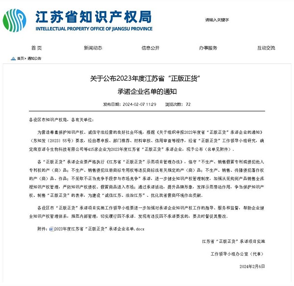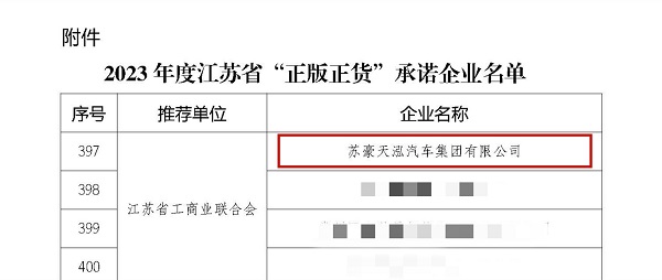 近日,江苏省知识产权局公布2023年度“正版正货”承诺企业名单,苏豪天泓汽车集团成功入选。