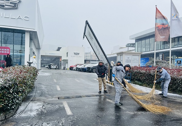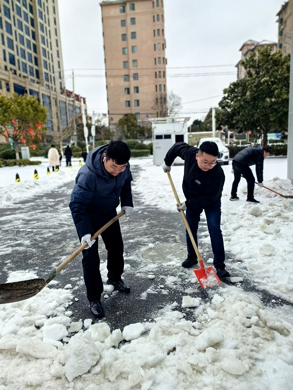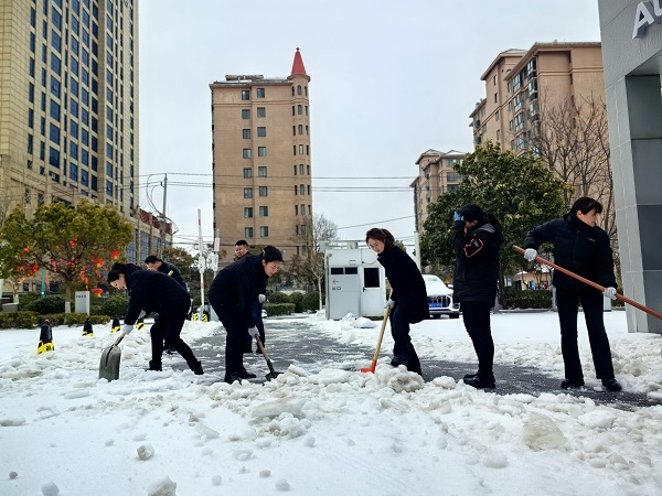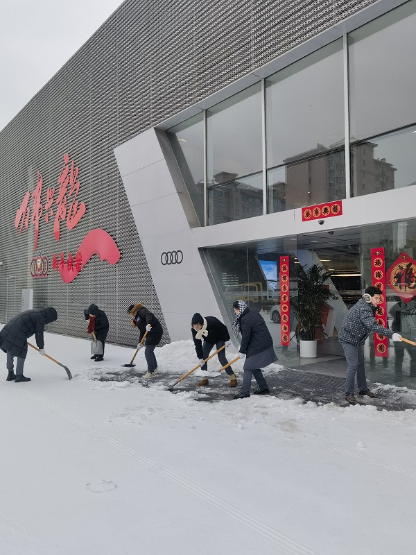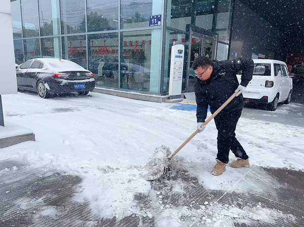 以雪为令,闻雪而动!集团旗下各4S店员工们挥舞着铁锹、扫帚等工具,对主要进出通道、展厅车间门前、路边等重点区域的积雪进行了全面清扫。他们默契配合,有的负责铲雪,有的负责清扫,有的负责指挥交通,确保清扫工作有序进行。他们的衣服被雨雪打湿,鞋袜也被冻得僵硬,但他们却始终坚守在岗位上,用实际行动诠释着“责任、专业、值得信赖”的服务理念。