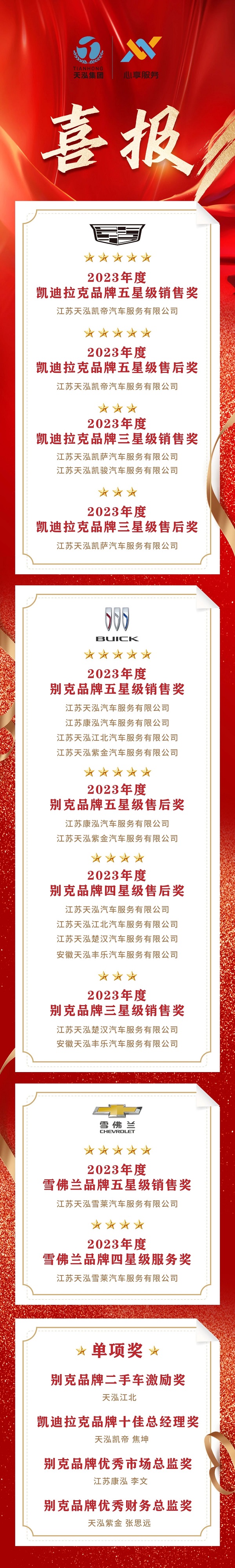 凯迪拉克品牌上:天泓凯帝获得“销售五星、售后五星”称号,天泓凯萨获得“销售三星、售后三星”称号,天泓凯骏获得“销售三星”称号。