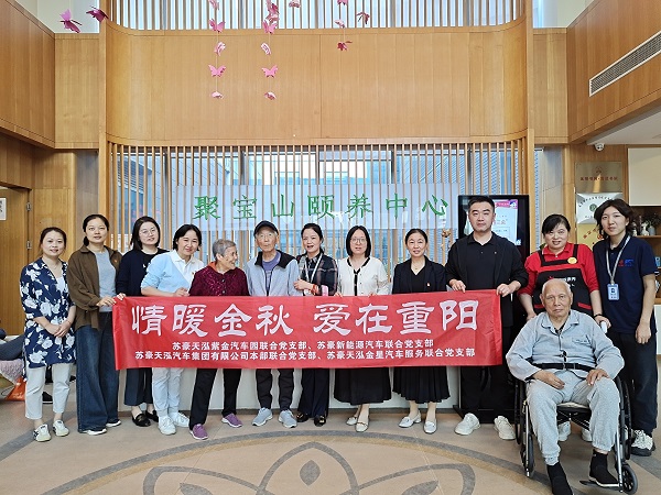 10月11日,正值重阳佳节之际,苏豪天泓本部联合党支部、新能源汽车联合党支部、紫金汽车园联合党支部及金星汽车服务联合党支部的党团员代表,前往南京钟山银城聚宝山颐养中心开展“情暖金秋,爱在重阳”敬老活动,为老人们送去关爱与温暖。