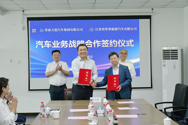 5月8日上午,苏豪天泓汽车集团有限公司与江苏省外事旅游汽车有限公司签署战略合作协议,建立可持续发展的战略合作伙伴关系。江苏外汽党委书记、董事长陈云高,苏豪天泓党委书记、董事长徐非出席签约仪式。