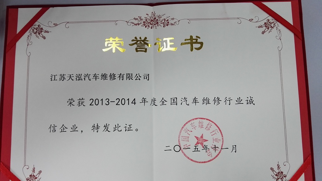 经过推选、审查、评选、公示等环节,11月18日,中国汽车维修行业协会对全国884 家企业授予“2013—2014 年度全国汽车维修行业诚信企业”称号,开云手机入口官网子公司江苏天泓汽车维修有限公司、江苏天泓楚汉汽车服务有限公司获此殊荣。开云手机入口官网将再接再厉,秉承诚信经营理念,带领全集团奋发努力、精益求精,不断为汽车维修行业诚信建设做出新的贡献。