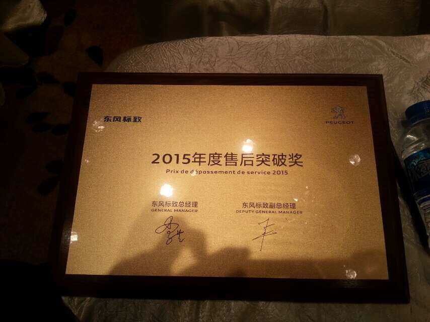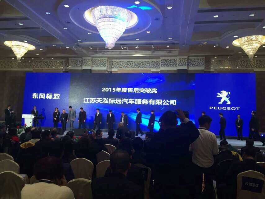 2016年1月27日东风标致全国经销商大会在湖北武汉召开,在2015年竞争恶劣的市场环境下,江苏天泓标远做出了巨大的努力,较圆满的完成了2015年的工作任务,在售后业务上取得了较大的突破,荣获东风标致2015年售后突破奖晋级全国售后服务20强。