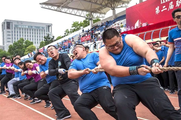 下午的团体赛中,大家齐心协力,在“8字跳绳”、“运转乾坤”、“一站到底”等比赛项目中,赛场内外加油声不断,场下运动员们总结经验,制定方案,争夺最后的胜利。伴随一声哨响,终极对决“拔河”比赛将运动会推向高潮,天泓的运动员全力以赴,个个鼓足劲、咬紧牙、面红耳赤,场外为运动员加油的呐喊声也此起彼伏,最终,天泓队一路过关斩将,在拔河比赛中赢得了冠军。