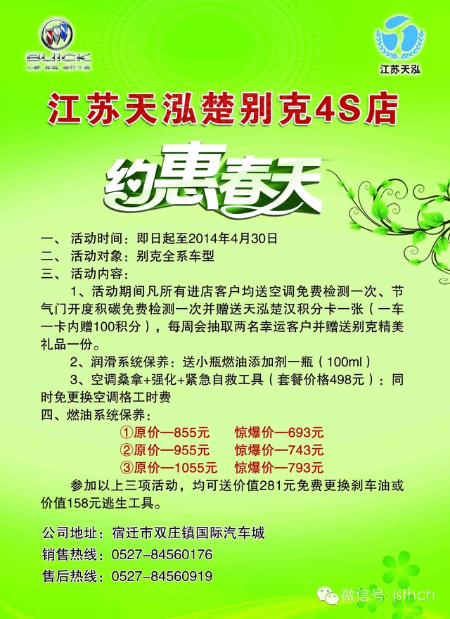 1、活动期间凡进店客户均送空调免费检测一次、节气门开度积碳免费检测一次并赠送天泓楚汉积分卡一张(一车一卡内赠100积分),每周会抽取两名幸运客户赠送别克精美礼品。
