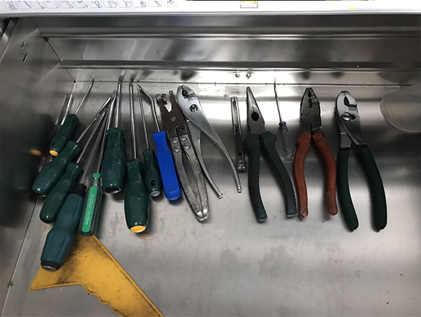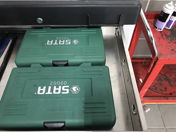 这是周领日常工作中工具箱里摆放的整齐的工具,用他自己的话讲,这样摆放维修车辆时用起来得心应手,不会乱,这些也是周师傅对徒弟的要求。他班组包干区的5S每天都是严格按照工位点检表要求执行的。