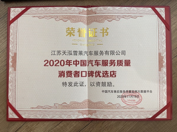 2020年天泓雪莱中国汽车服务质量消费者口碑优选店
